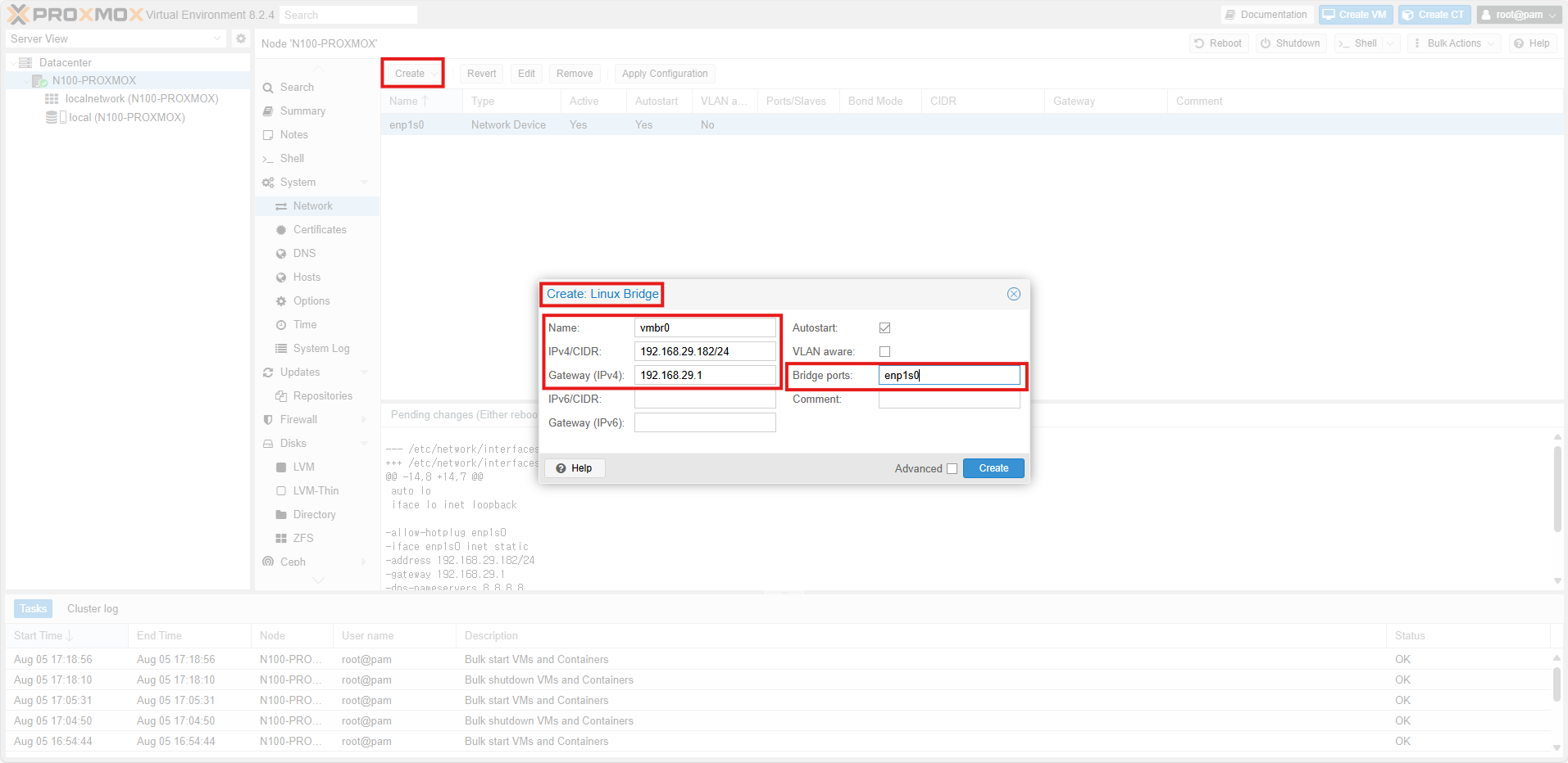 아래와 같이 enp1s0, vmbr0 2개가 생성되었다면 적용하기 위해서 Apply Configuration 을 눌러주세요.