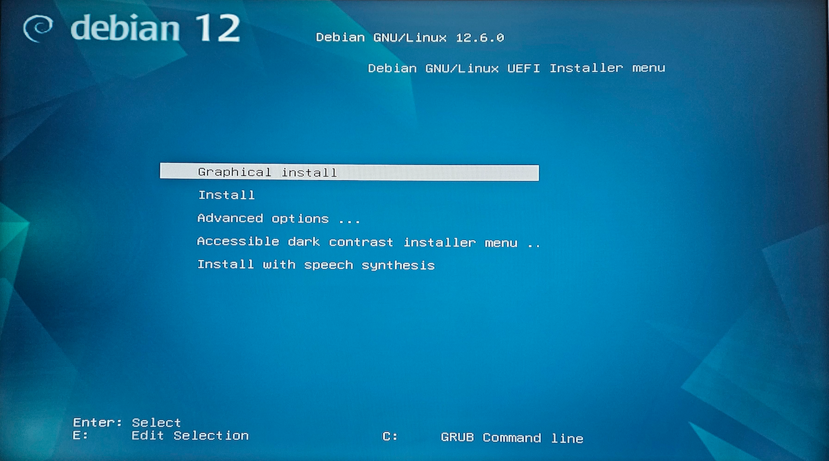 아래와 같이 debian 12 화면이 뜬다면 정상적으로 인식이 되신 겁니다.