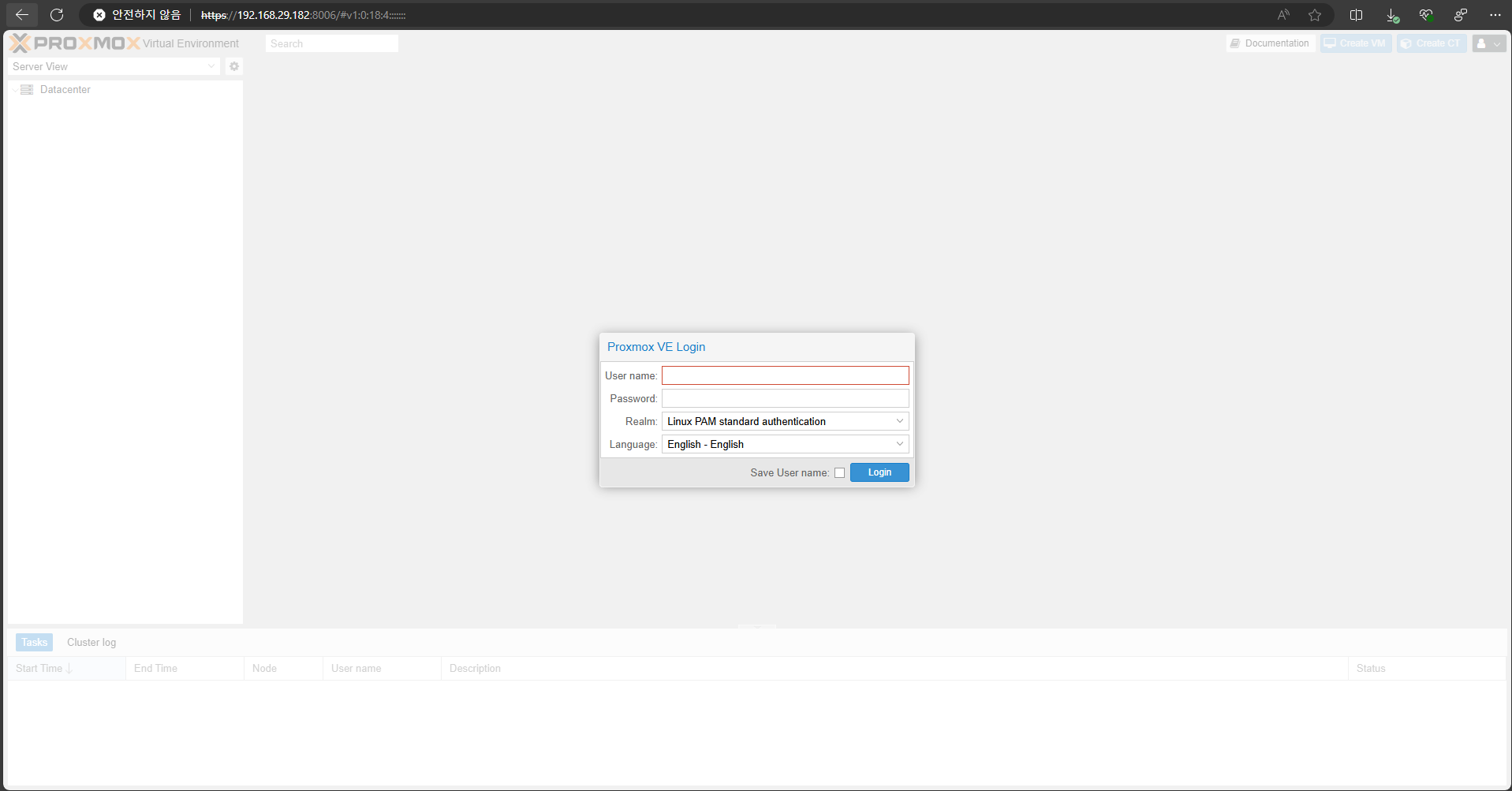 웹브라우저에서 https:// [Server IP]:8006 으로 접속하시면 아래와 같이 로그인 창이 뜨면 설치가 정상적으로 완료되었습니다.