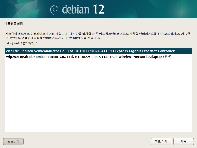 enp1s0을 선택하고 계속을 눌러서 설치해줍니다.