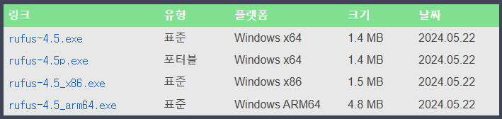 저의 경우 "rufus-4.5p.exe" 포터블 버전을 받았습니다.