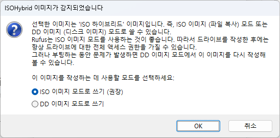 아래와 같이 "ISO 이미지 모드로 쓰기 (권장)" 를 누르고 OK를 눌러주세요.