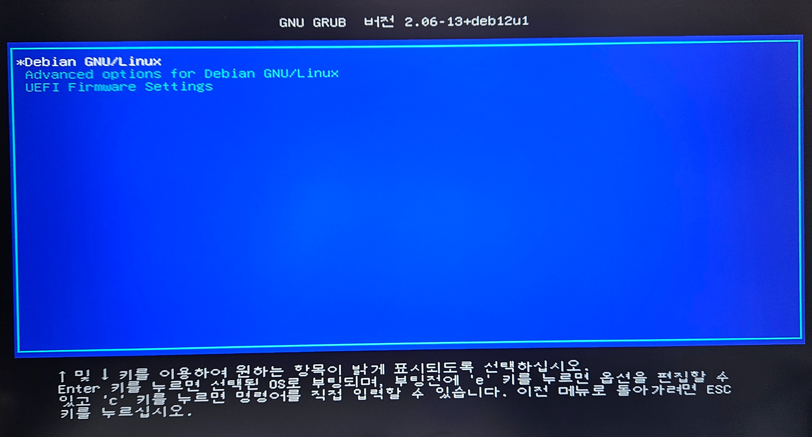 아래와 같이 debian 12 화면이 뜬다면 정상적으로 인식이 되신 겁니다.