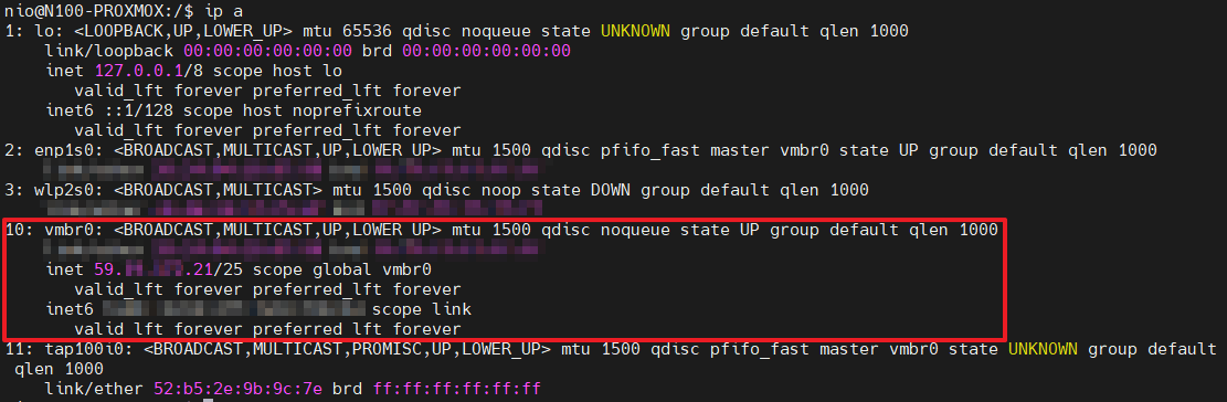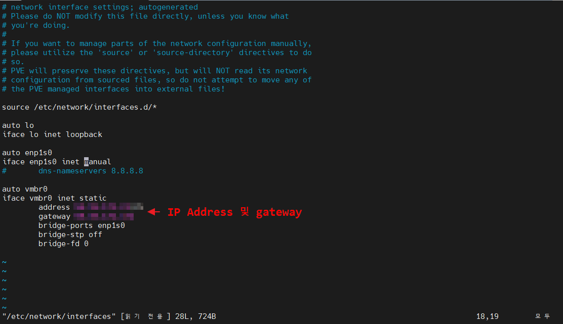 아래 기존 생성된 vmbr0 의 IP와 Gateway 만 변경해주면 됩니다.