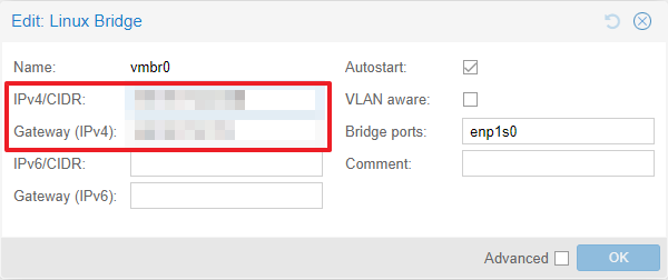 아래 기존 생성된 vmbr0 의 IP와 Gateway 만 변경해주면 됩니다.